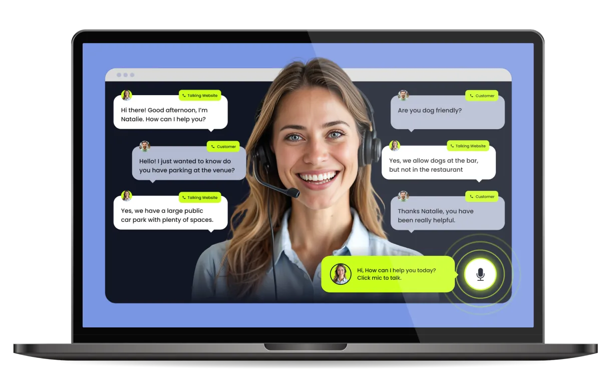 A Talking Website adds AI voice and/or text interaction to your existing site. Visitors can ask questions and receive instant answers without needing to fill in forms or call your team.